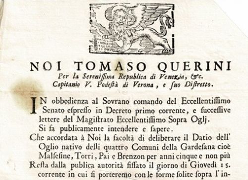 I bandi presenti nell’archivio storico del Comune di Bardolino riportano le caratteristiche che le olive dovevano presentare per poter essere vendute sul territorio della Gardesana e nella città di Verona. I bandi riportavano i decreti emanati dal Senato della Repubblica Veneziana nei primi anni del XVIII secolo. (Red.)
