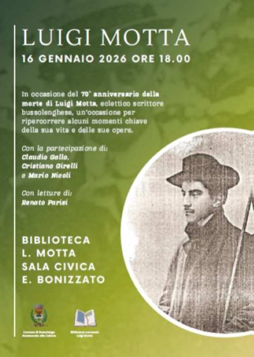 A seguire, Luigi Tacconi porterà una testimonianza diretta di quei fatti, vissuti in prima persona. «Ricordare Luigi Motta significa riscoprire una parte importante dell’identità culturale di Bussolengo. A settant’anni dalla sua scomparsa, vogliamo rendere omaggio a uno scrittore che, con la sua fantasia e il suo talento, ha saputo parlare a generazioni di lettori. Iniziative come questa sono fondamentali per valorizzare la memoria storica e letteraria del nostro territorio e per trasmetterla alle nuove generazioni», spiega Valeria Iaquinta, assessore alla Cultura del Comune di Bussolengo.